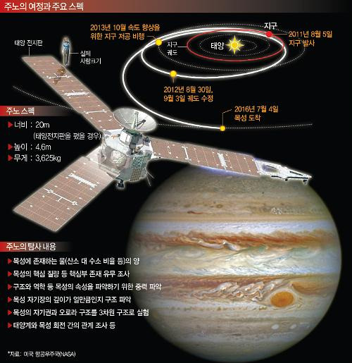 - 목성의 내부 구조, 자기장, 대기 조성, 남북극의 오로라 현상 등을 탐사.