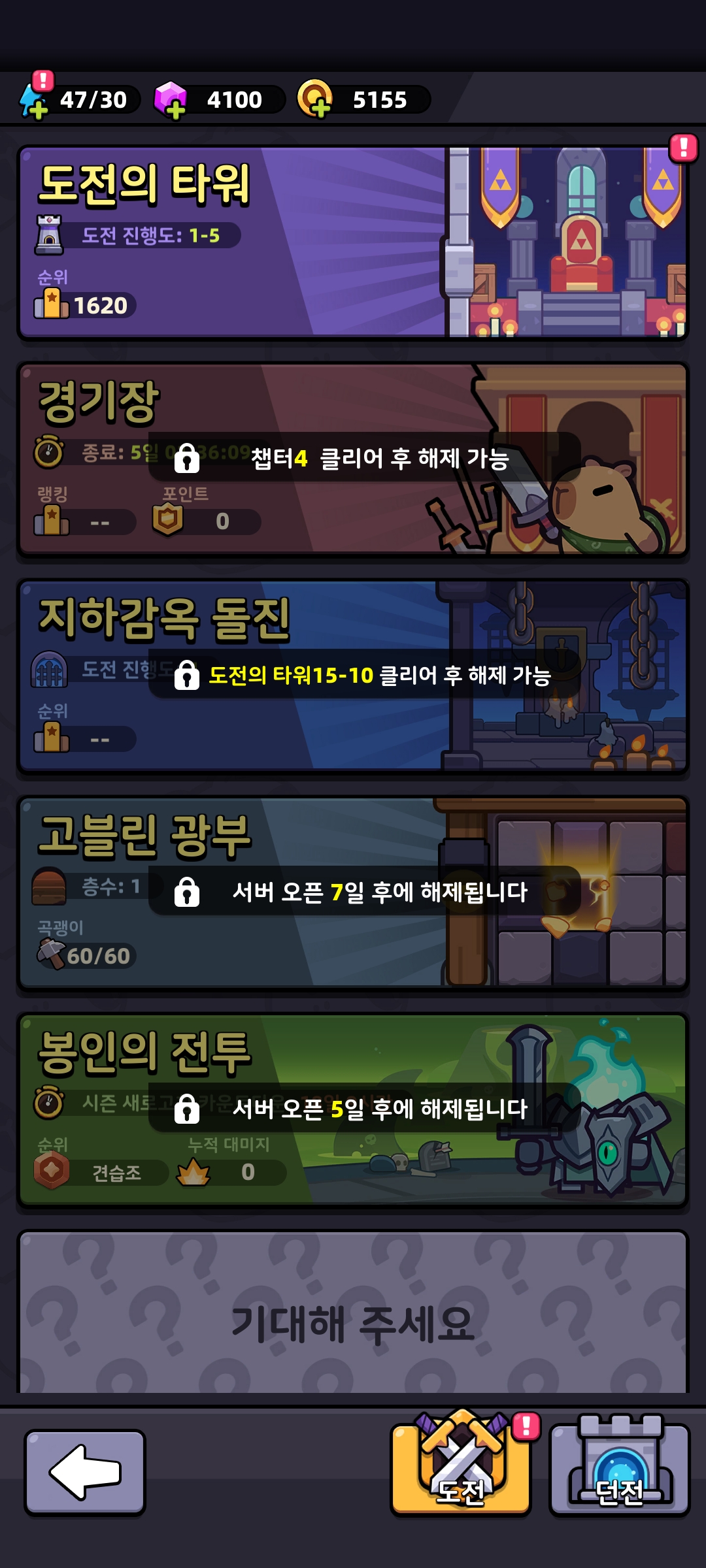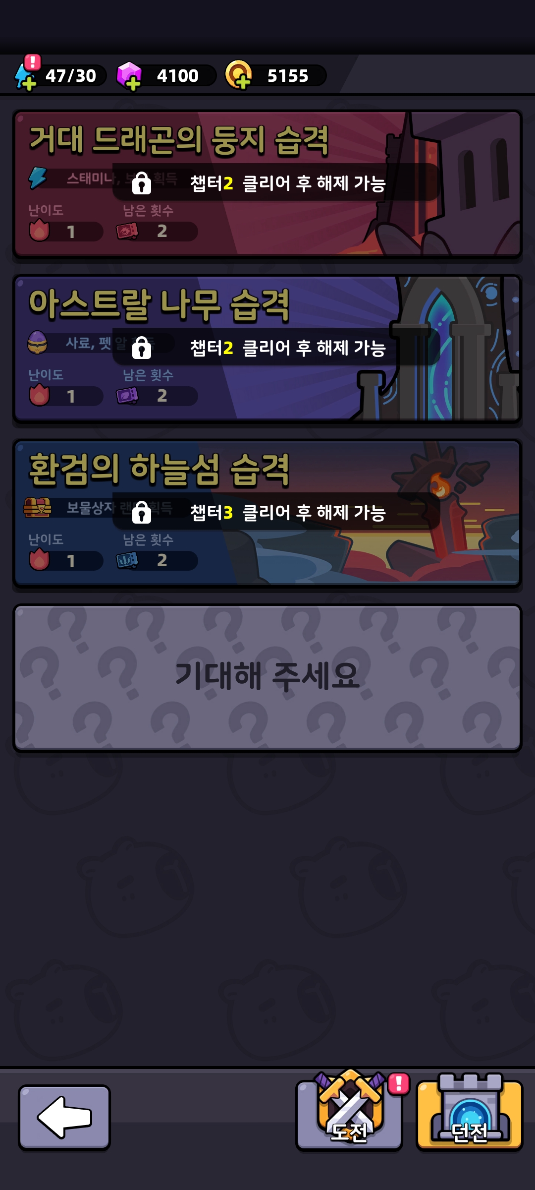 - 도전권 1장 소모, 골드/강화석/장비 도면 보상.