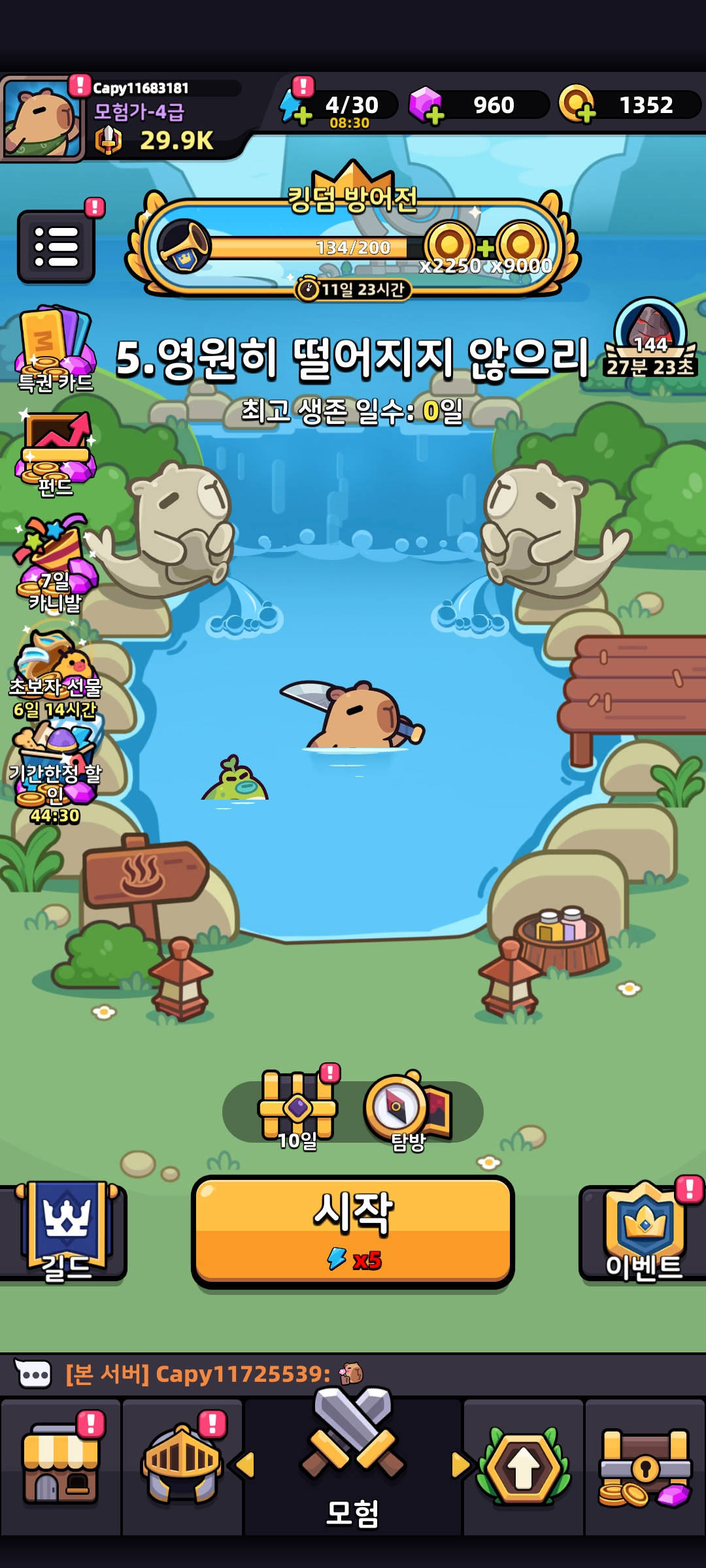 카피바라는 추억의 텍스트 기반 머드게임을 떠올리게 하는 게임이고, 이 게임은 메인 챕터, 탐방, 도전, 던전 모험을 할 수 있다.