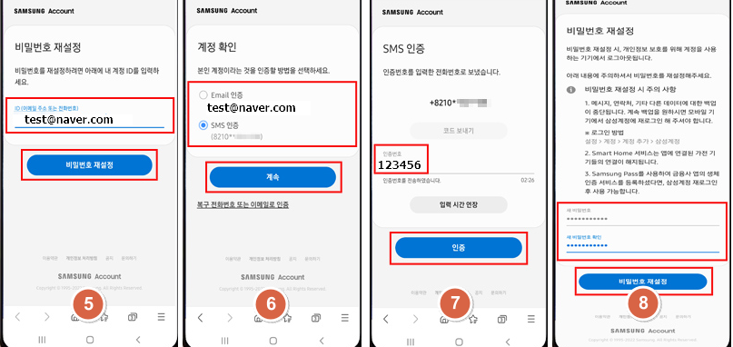 모바일폰에서 삼성계정 비밀번호 분실 시 재설정 방법입니다.