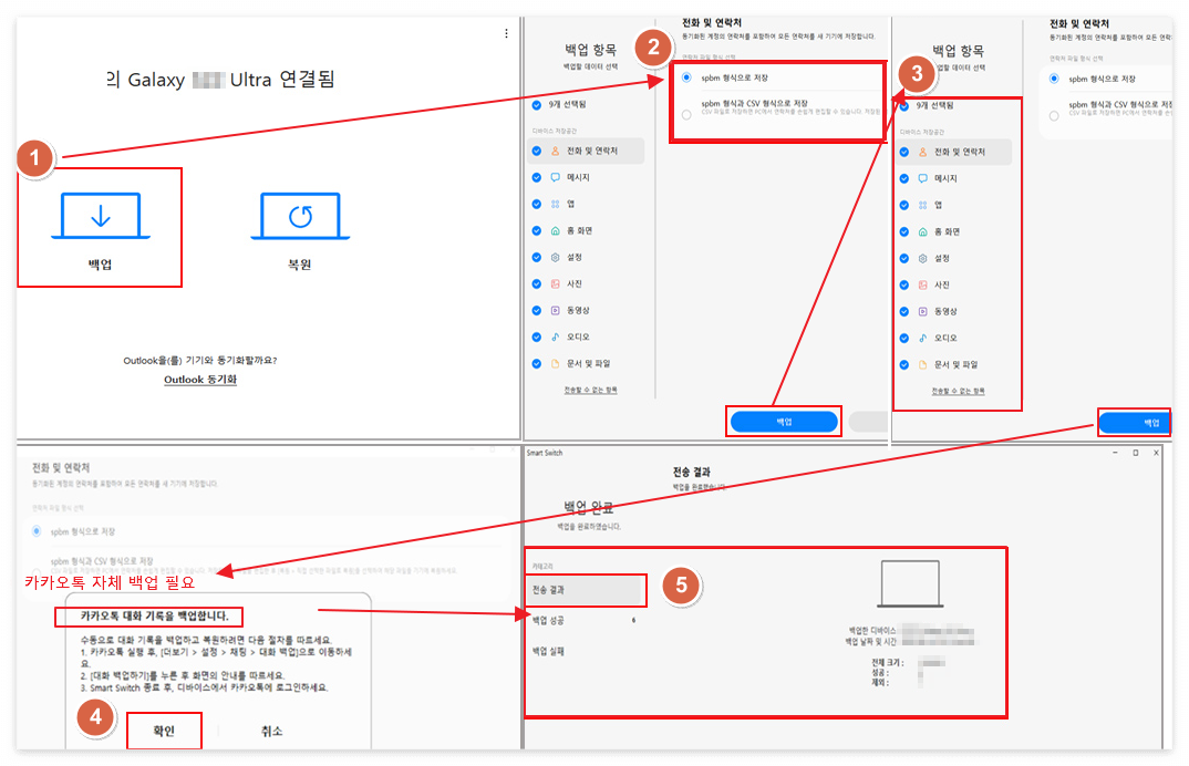 - 스마트 스위치로 백업되지 않는 일부 앱 데이터(특정 앱 내 로그인 정보 등)가 있을 수 있으니, 별도로 확인하세요.