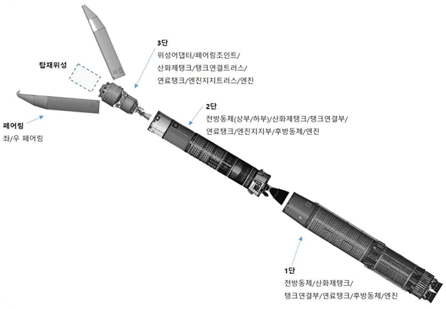 - 1단에는 75톤급 액체엔진 4기가 클러스터링되어 사용되고, 2단에는 75톤급 1기, 3단에는 7톤급 1기가 사용됩니다.
