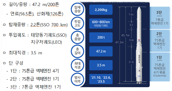 - 누리호는 3단 액체로켓으로 설계되었으며, 전체 길이 약 47.2 m, 직경 약 3.5 m, 총 중량 약 200톤입니다.