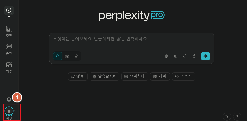 - Perplexity 웹사이트에 로그인 후 좌측 메뉴에서 “계정”으로 이동합니다.