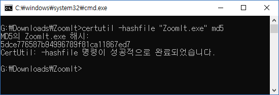 ZoomIt.exe 파일의 md5 해시값을 certutil 명령어를 이용하여 구한결과,
