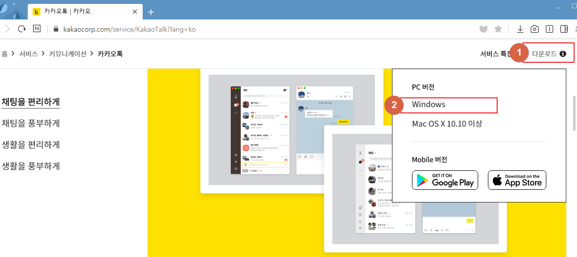 ○ 'https://www.kakaocorp.com/service/KakaoTalk?lang=ko' 에 접속해서 아래 화면 1번 항목 클릭후 2번항목에서 윈도우나 맥용 카카오톡 PC 버전을 다운로드 할 수 있습니다.
